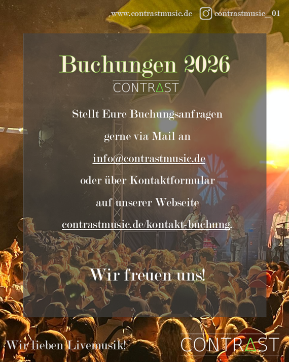 Wir sind die Coverband Contrast aus dem Kuseler Musikantenland. Wir freuen uns, dass Ihr auf unserer Seite gelandet seid und hoffen Euch einen guten Eindruck von uns zu schaffen!